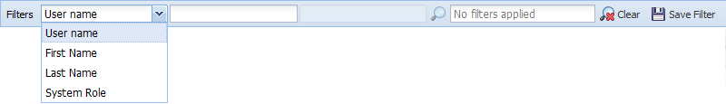 In the Filters panel, select the Username, First Name, Last Name, or System Role from Filters drop-down, enter User name, First Name, Last Name, or System Role and click .