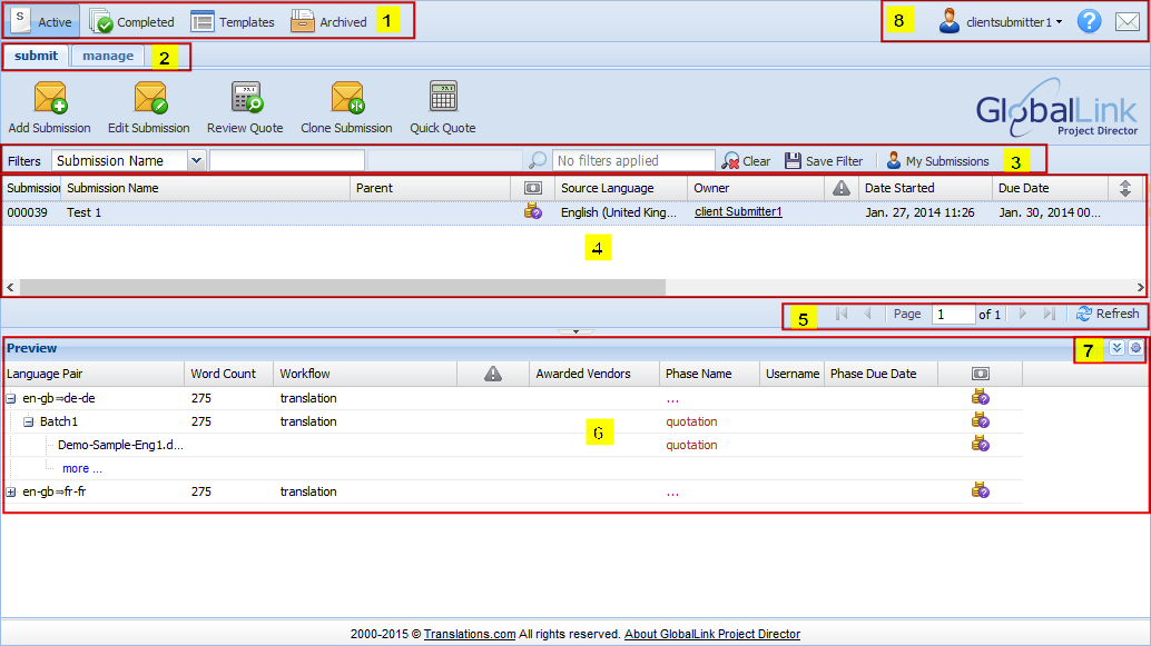 Below are descriptions of various components of the GlobalLink® Project Director dashboard: